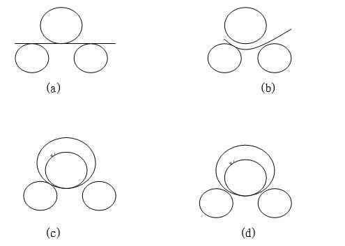該機(jī)結(jié)構(gòu)形式為三輥對(duì)稱式。上輥在兩下輥中間對(duì)稱位置作垂直升降運(yùn)動(dòng),通過蝸輪、蝸桿而獲得,兩下輥?zhàn)餍D(zhuǎn)運(yùn)動(dòng),通過減速機(jī)的輸出齒輪與下輥齒輪嚙合,實(shí)現(xiàn)板材的行走。當(dāng)上輥的下壓力超過材料的屈服限度時(shí),便使所卷制的材料變形,變形過程如下圖:
